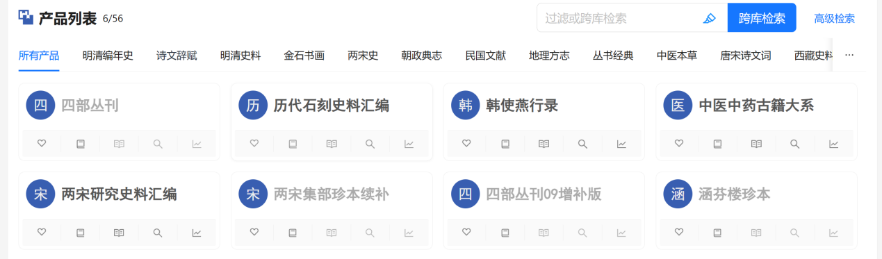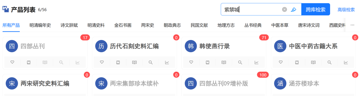 此页包含古籍库所有产品的入口,也可以检索某个关键词在所有产品中出现的次数。