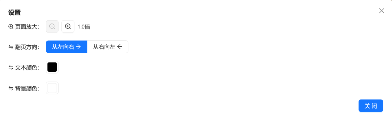 • 设置:设置页面显示放大倍数、翻页方向、文本颜色和背景颜色。